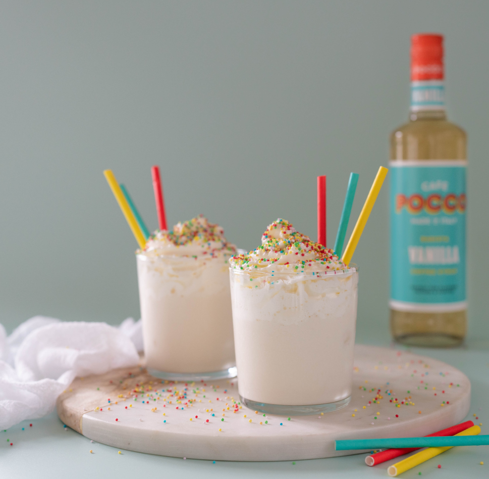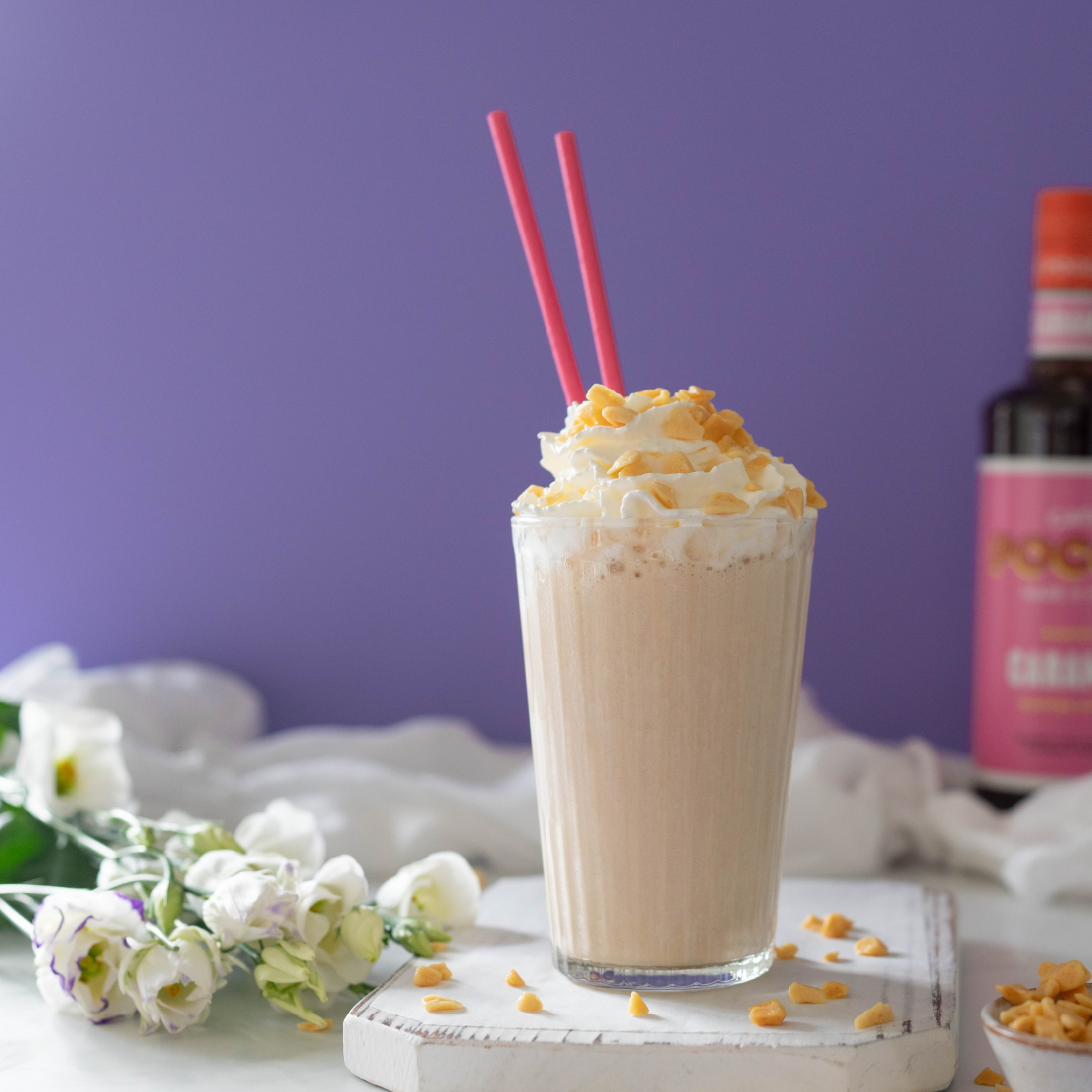 Simply add everything in a blender and blend until smooth, then serve in a tall glass and sprinkle. Perfect with any Pocco Syrup
